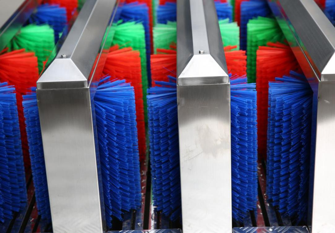 2、 電機驅(qū)動清洗臺上的 5 組刷子,高壓噴淋清水。