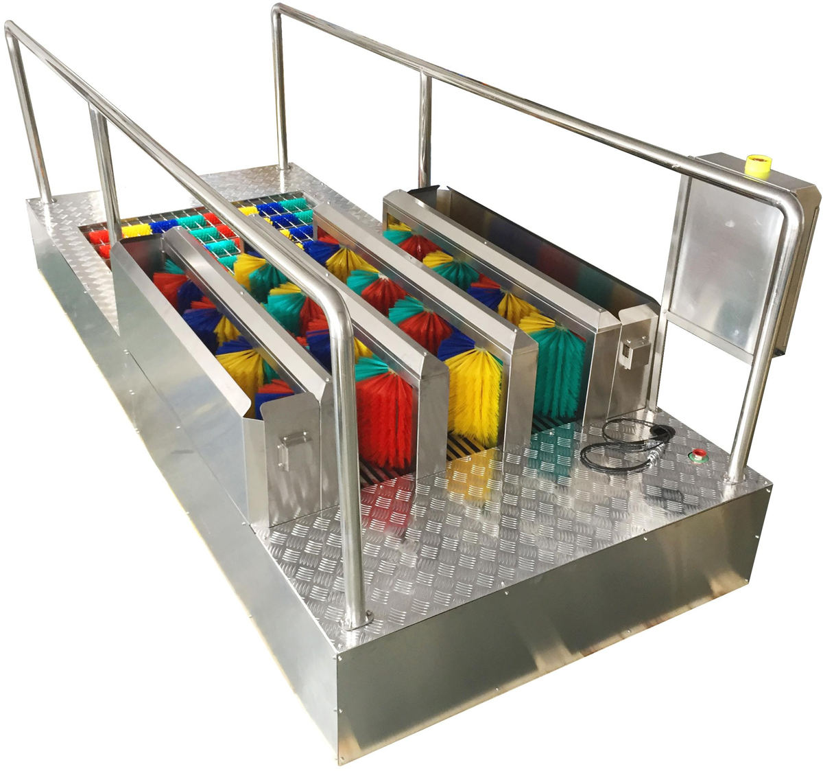 3、 使用人員行走在清洗臺上,利用刷子轉(zhuǎn)動刷洗鞋底達到清潔效果。